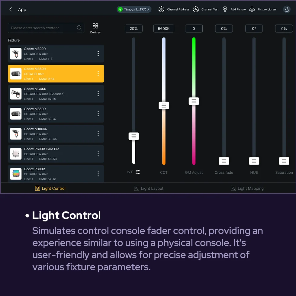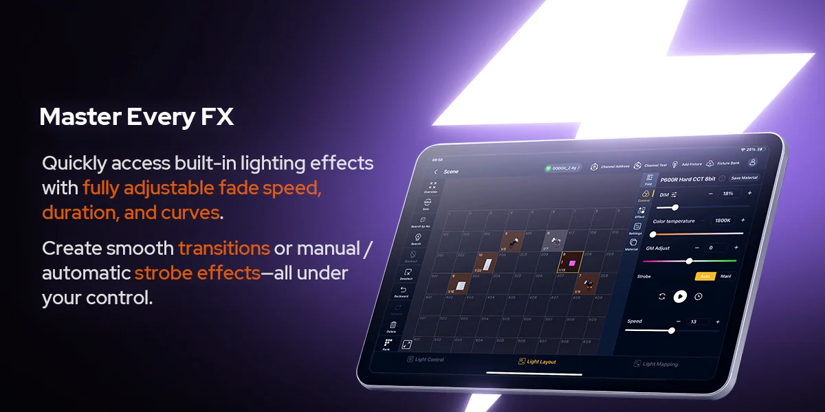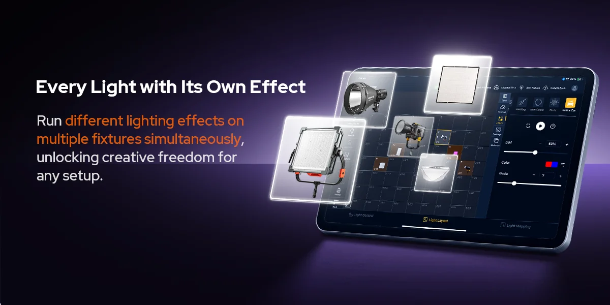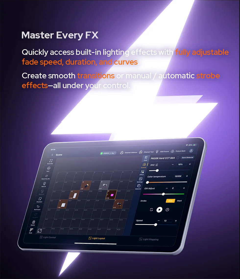 Godox KNOWLED APP, a professional lighting control tablet app, streamlines lighting workflows. Designed for large-scale lighting setups, its fixture layout interface, integrated MIDI support and mapping features enable flexible, precise adjustments--where every creative moments is free to unfold.