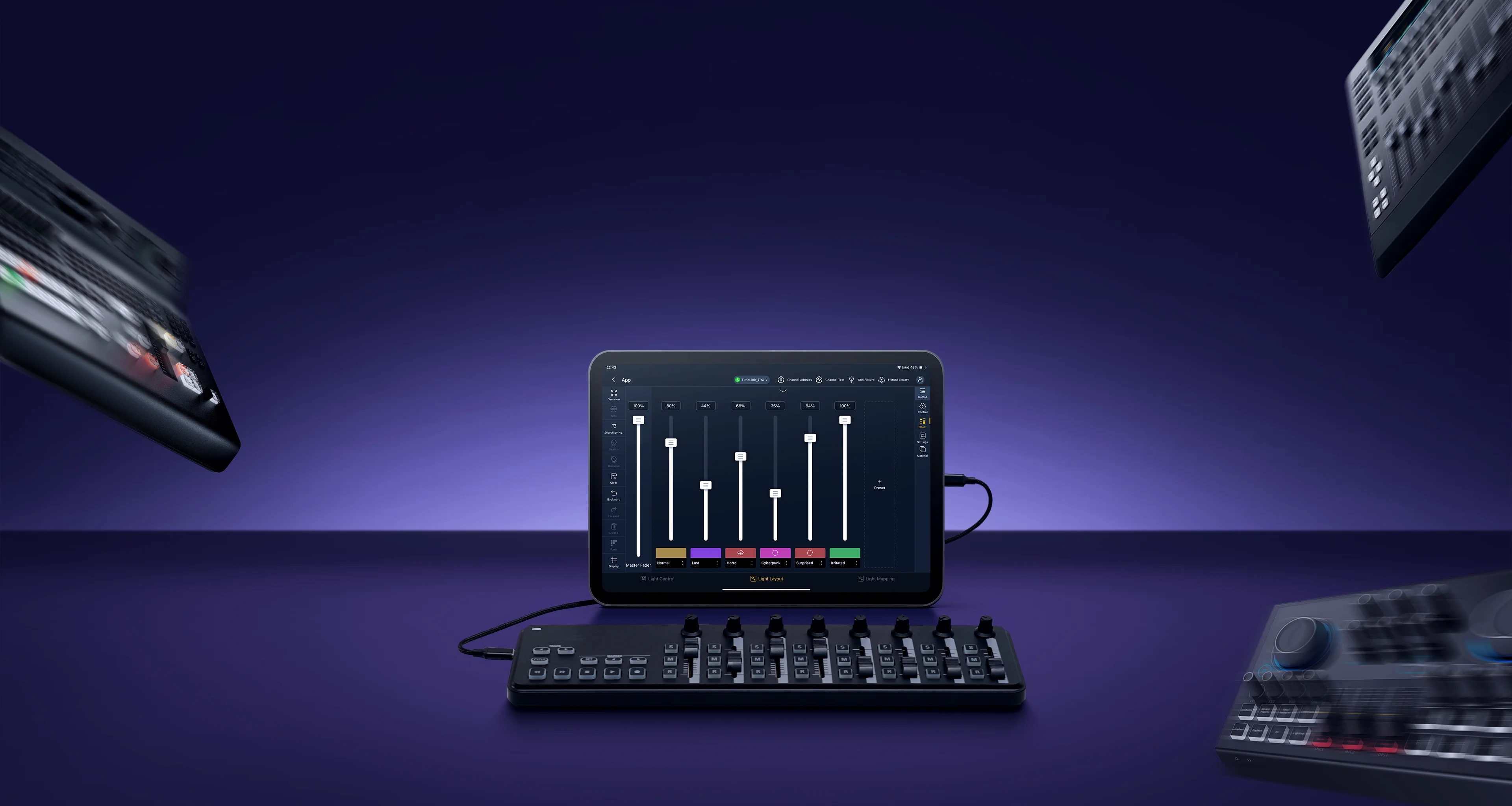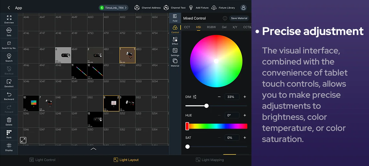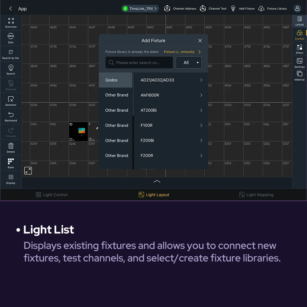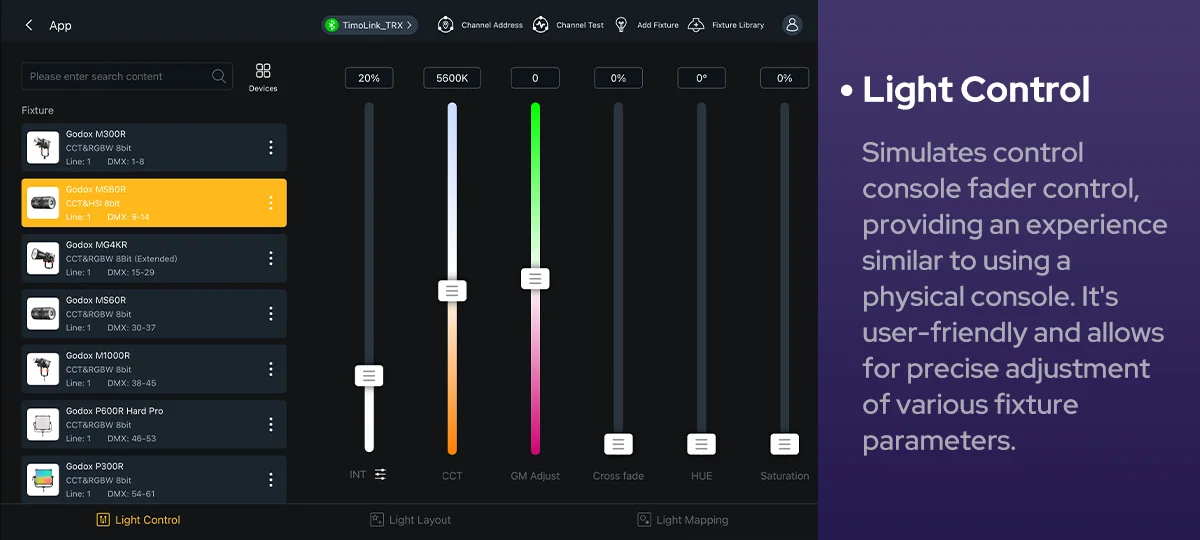 Godox KNOWLED APP, a professional lighting control tablet app, streamlines lighting workflows. Designed for large-scale lighting setups, its fixture layout interface, integrated MIDI support and mapping features enable flexible, precise adjustments--where every creative moments is free to unfold.