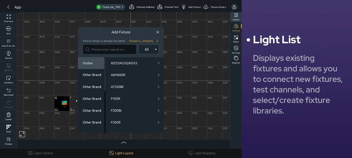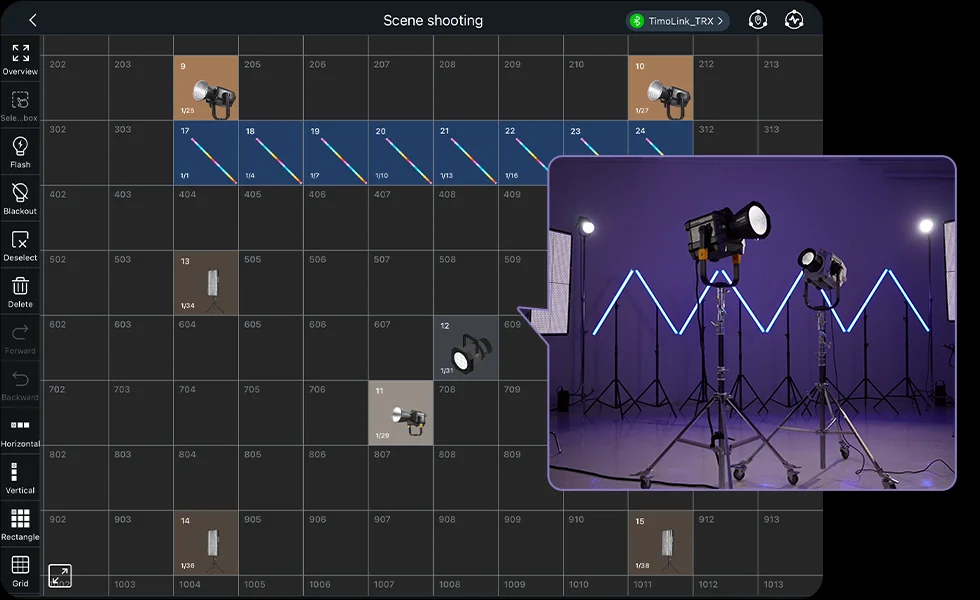 With the Godox KNOWLED app, you can easily position fixtures on the grid to match your on-set lighting setup. This provides a crystal-clear view of all fixture positions and statuses, making it highly intuitive. It streamlines your creative work and boosts efficiency.
