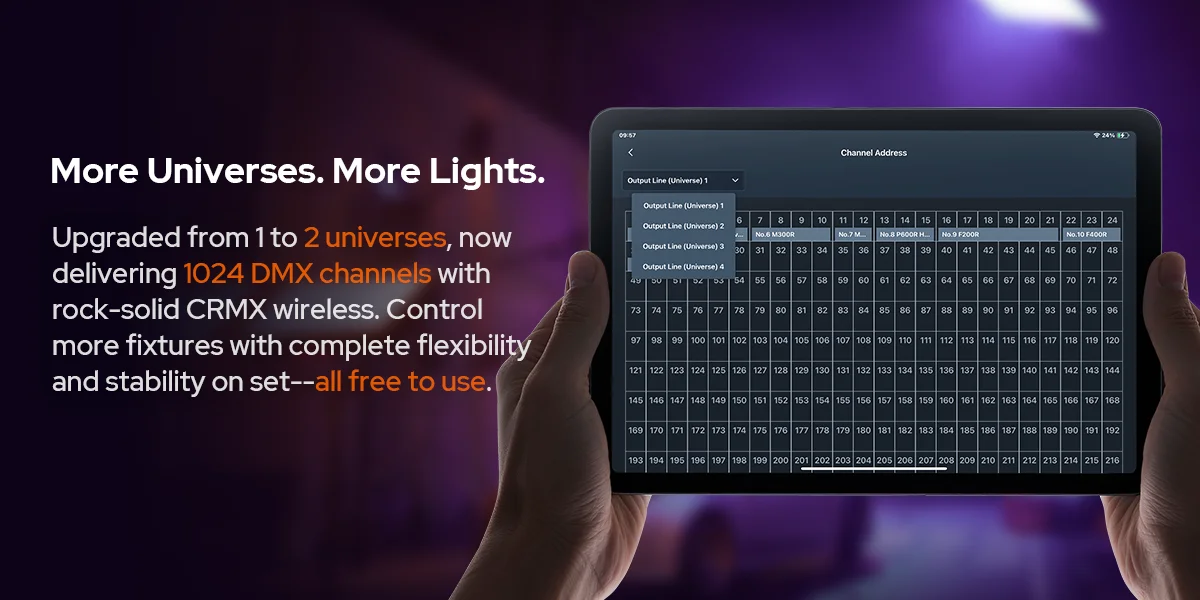Upgrading to 2 universes and 1,024 channels, each light can run its own effect with enhanced FX options for richer visual expression. Save and share fixtures through a global community. Collaborate with team via QR codes to transfer setups—from creation to collaboration, made effortless.