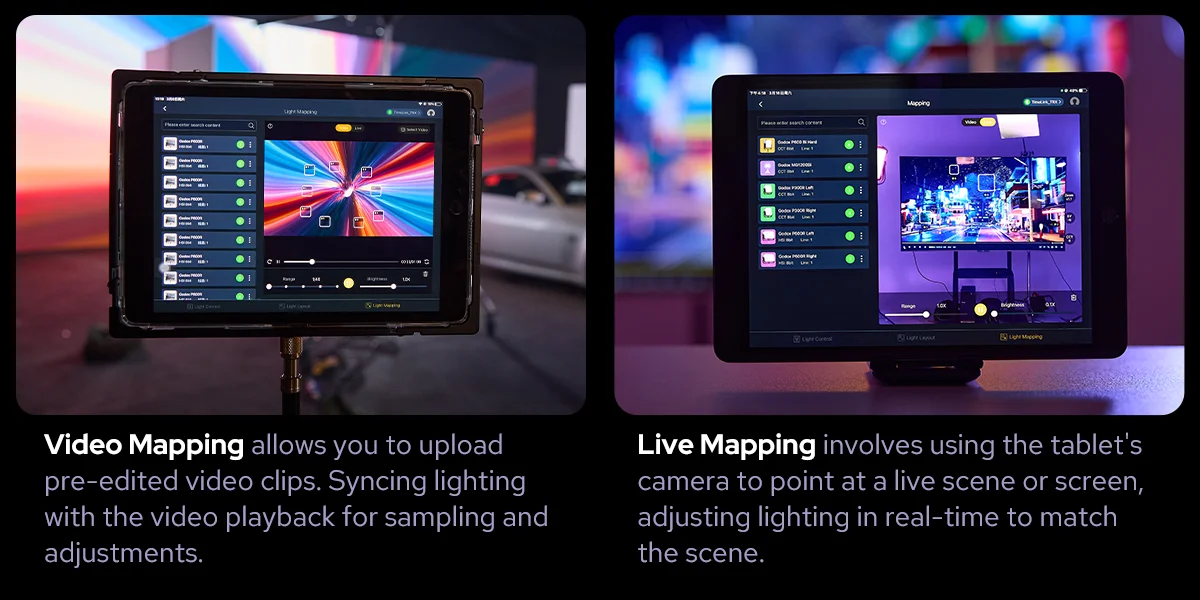 The Godox KNOWLED app makes Light Mapping accessible to all, enabling easy scene and lighting matching from your tablet. It requires no extra tools, allowing for the creation of realistic visuals with simple operations. This app simplifies complex light mapping and manages production costs.