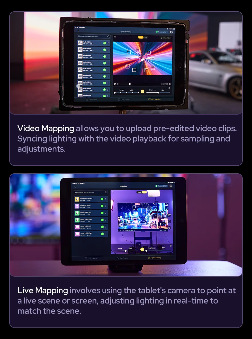 Godox KNOWLED APP, a professional lighting control tablet app, streamlines lighting workflows. Designed for large-scale lighting setups, its fixture layout interface, integrated MIDI support and mapping features enable flexible, precise adjustments--where every creative moments is free to unfold.
