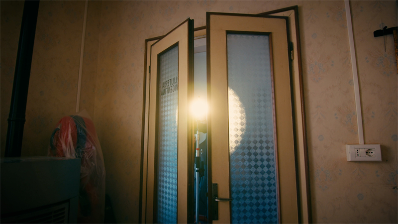 Additionally, it can be conveniently controlled via an app, which is perfect, especially when it's positioned at a distance. Our aim is not to directly illuminate Alberto with this light but to fill the room with a sun-setting effect on the horizon. Our gaffer, Tommaso, is now ready to turn on the M300Bi. In Italy, when we want the gaffer to turn on the light, we just shout, "Biascica, apri tutto! smarmella!" I find it quite poetic. Voilà! We now have our main light source.